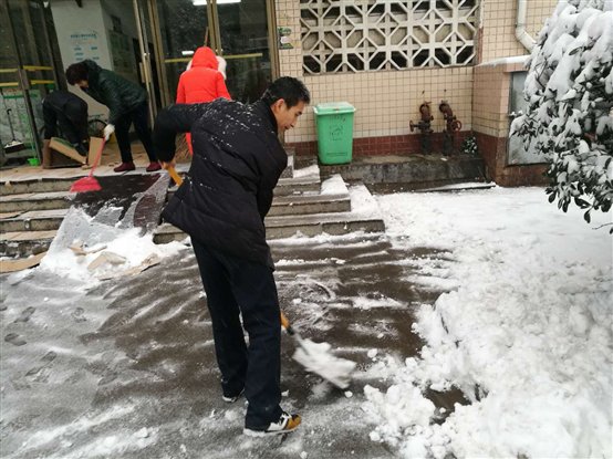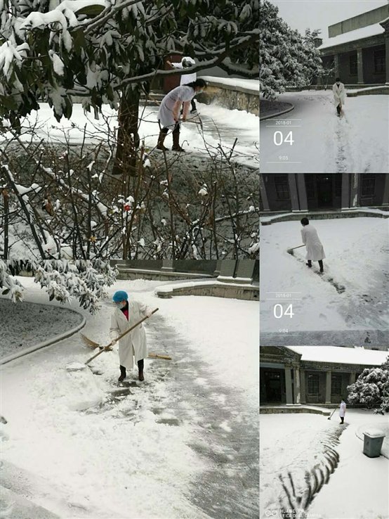2018年1月4日,我们迎来了2018年的第一场雪。今年第一场大雪给人们带来美丽风景和清新空气,增添了别样的色彩,却给我们生活带来了不便。在欣赏银装素裹美景的同时,降雪也考验着我们的素质。校医院新老校区职工不畏严寒在第一时间打扫道路,方便师生,方便患者前来就医,方便大家。